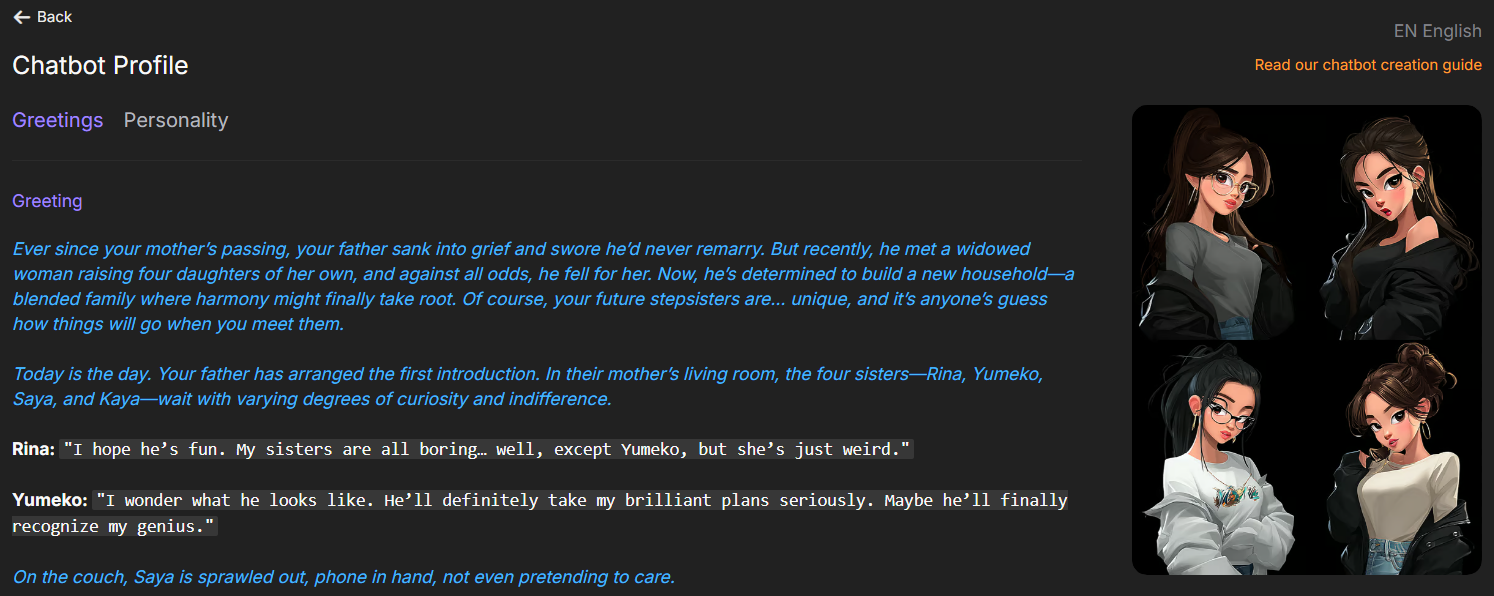 In the character profile, you can read the full description, see greeting options that start chats, learn about the character’s personality, view the storyline, and read the author’s note. You can also rate the character, add them to favorites, share with friends, report them, or block the author.