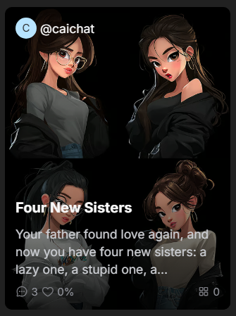 CAICHAT.AI hosts a vast collection of unique characters created by users from around the world! Looking for casual conversation? Or do you prefer exciting roleplay scenes, perhaps with a touch of intimacy? Everything is here.