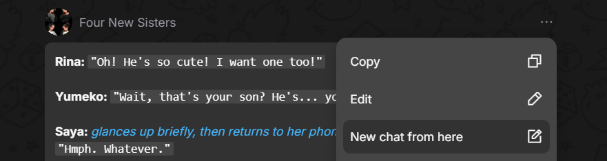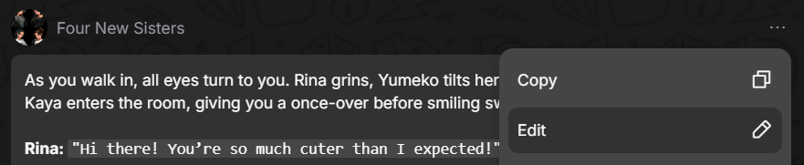 To steer the story in the desired direction, use the message editing feature and write the response you want the character to say. To do this, click the three dots in the top-right corner of the message and select .